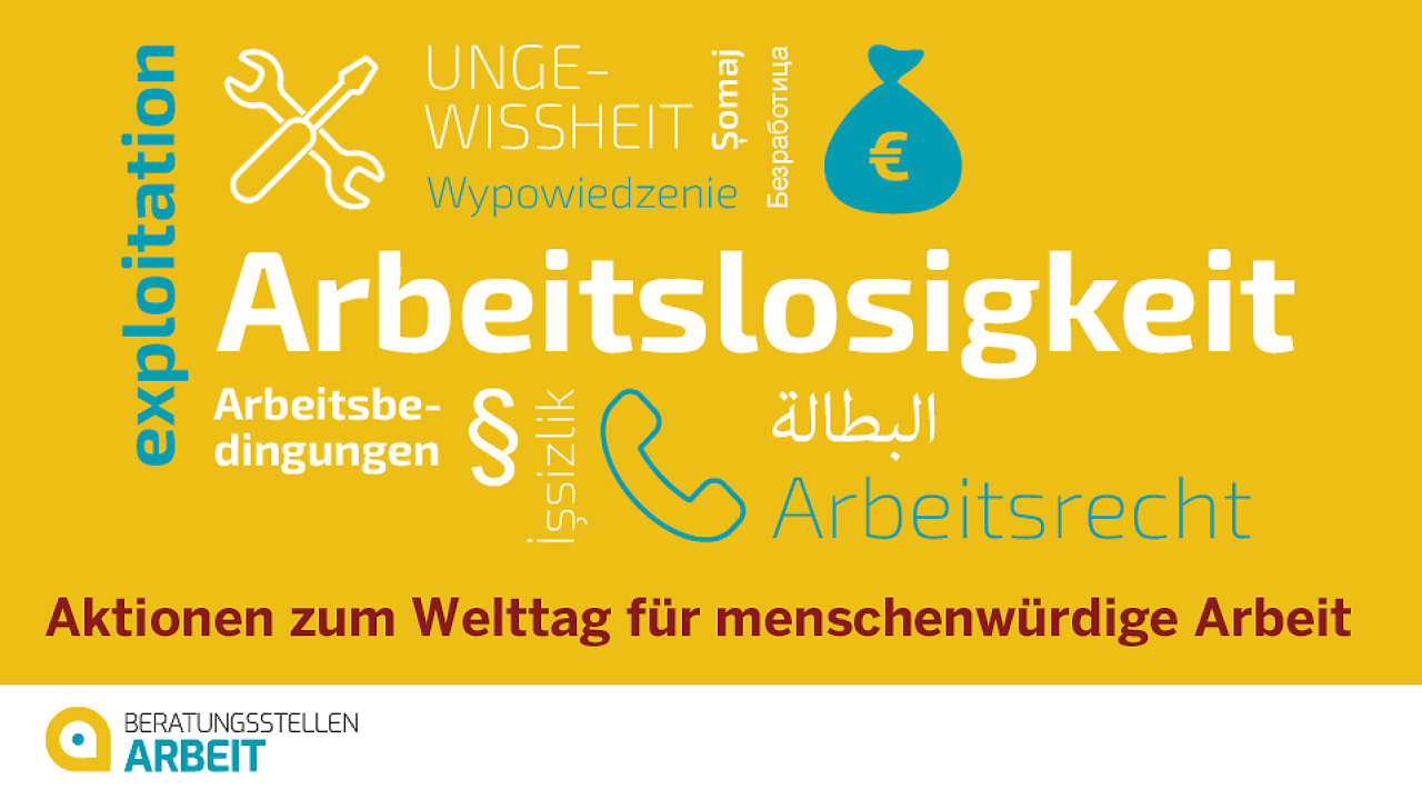 Der Welttag für menschenwürdige Arbeit wird jährlich am 7. Oktober 2024 begangen. Er geht auf eine Initiative des Internationalen Gewerkschaftsbunds im Jahr 2008 zurück. Organisationen weltweit setzen an diesem Tag ein Zeichen gegen prekäre Beschäftigung und für bessere Arbeitsbedingungen. Ihn nehmen die Beratungsstellen für Arbeit und die Beratungsprojekte gemeinsam mit dem Ministerium für Arbeit, Gesundheit und Soziales zum Anlass, um auf ihre Angebote aufmerksam zu machen.